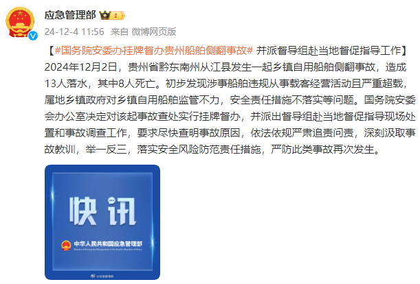 2024年12月2日,贵州省黔东南州从江县发生一起乡镇自用船舶侧翻事故,造成13人落水,其中8人死亡。初步发现涉事船舶违规从事载客经营活动且严重超载,属地乡镇政府对乡镇自用船舶监管不力,安全责任措施不落实等问题。国务院安委会办公室决定对该起事故查处实行挂牌督办,并派出督导组赴当地督促指导现场处置和事故调查工作,要求尽快查明事故原因,依法依规严肃追责问责,深刻汲取事故教训,举一反三,落实安全风险防范责任措施,严防此类事故再次发生。